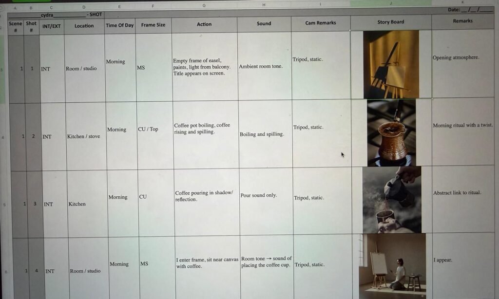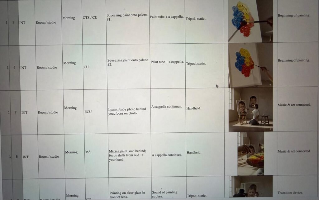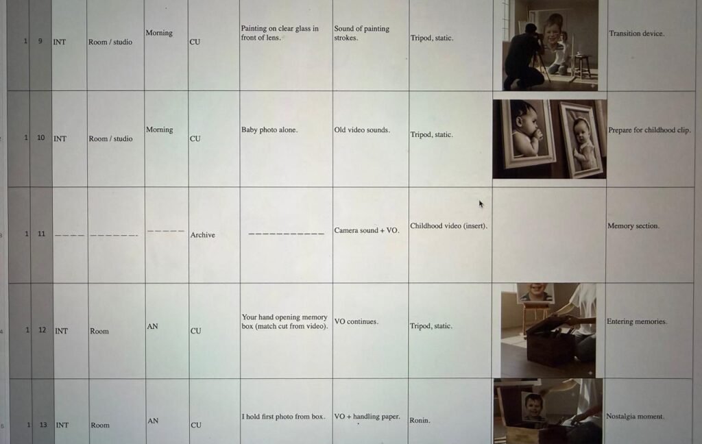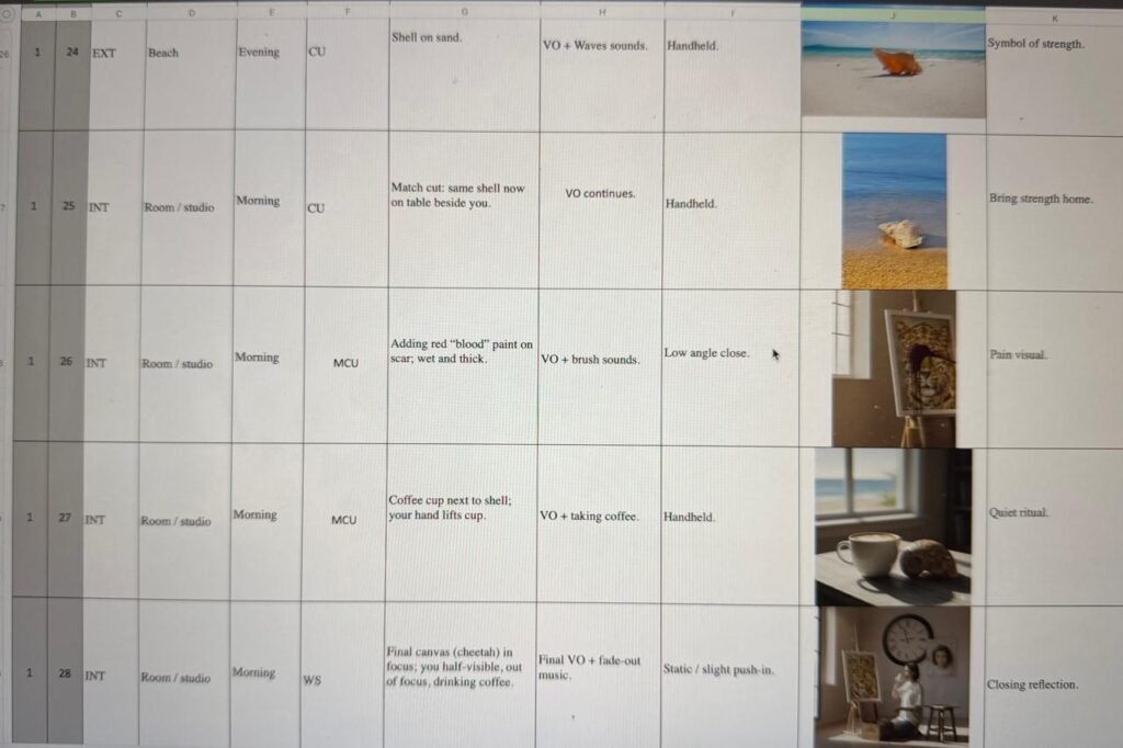 The room is almost empty, pale walls, an easel by the balcony, a table, a box on the floor so each new object changes the emotional temperature: the memory box turns the room into an archive; the school outfit and clocks introduce pressure; the shell brings in the sea. The camera is mostly still, with shallow depth of field isolating details like boiling coffee, the edge of a photograph or the shine of wet red paint on the cheetah. Editing moves between three overlapping times: the present morning in the studio, an earlier past in childhood images and photos, and more recent difficult days ending at the beach. The sound design layers close interior noises with harder, mechanical sounds in the “hard day” section and almost pure waves at the shore, so that shifts in feeling are heard as well as seen.